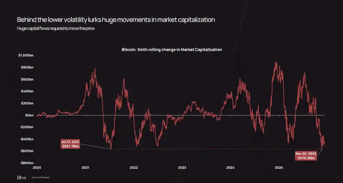 The firm's chart of "three-month changes in Bitcoin's market cap" shows that even during this low-volatility cycle, fluctuations in market cap still amount to hundreds of billions of dollars.
