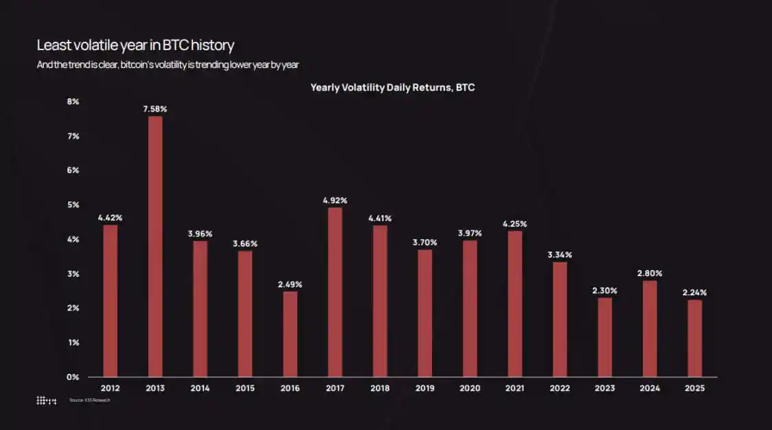 K33 Research's volatility chart, which dates back to 2012—when Bitcoin's daily volatility was 7.58%—shows that volatility has steadily decreased each cycle: 3.34% in 2022, 2.80% in 2024, and dropping to 2.24% in 2025.