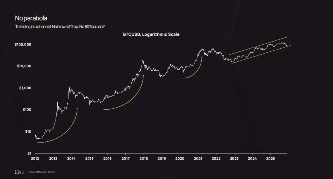 This creates a "perception gap": a 36% drop over six weeks still feels剧烈 intuitively; but compared to early cycles (when intraday 10% swings were the norm), the price action in 2025 was relatively calm.