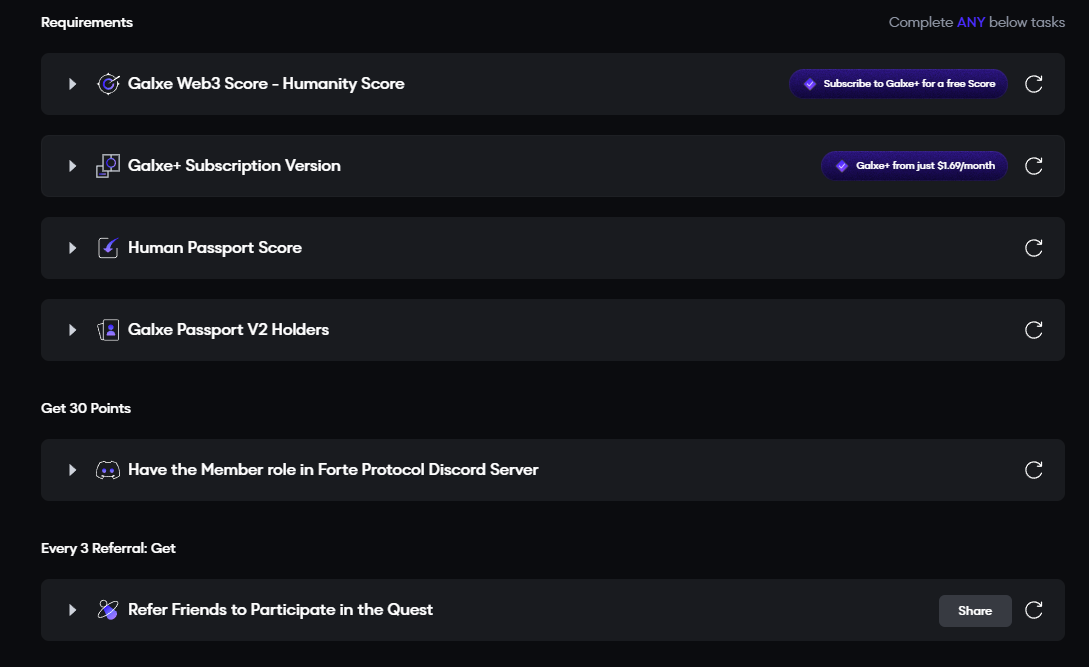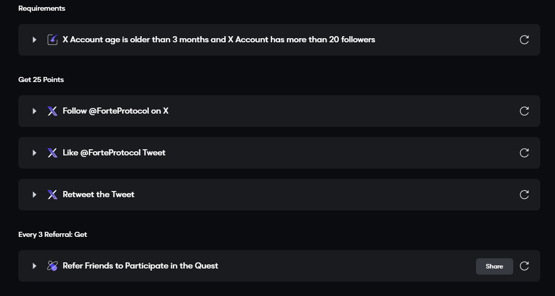 Galxe Task One: Spread the Word (Link: https://app.galxe.com/quest/ForteProtocol/GCHxctYayA?referral_code=GRFr2JLgLym0F_CjZtICIKop6-k3a5AWWjkhuI2Kg5uvmw): X account must be older than 3 months with more than 20 followers, and complete social tasks.
