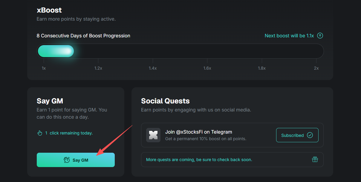 STEP 2. Click GM (daily check-in type task) to earn points. Additionally, joining the official TG and verifying will grant a 10% points bonus.