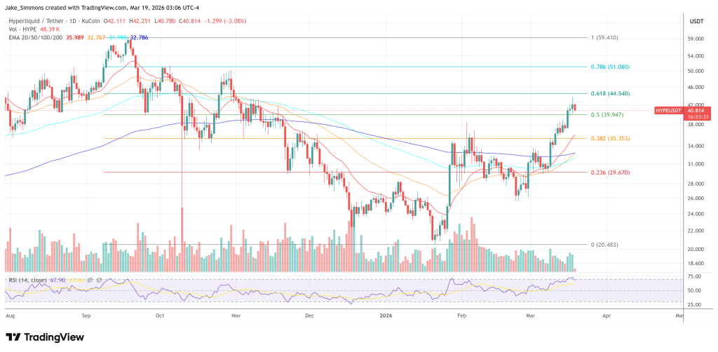 Hyperliquid processed more than $500 million in oil-linked volume over 24 hours on March 16, with HIP-3, its real-world-asset framework launched in October 2025, now accounting for as much as 30% of daily trading volume. HYPE has moved with that shift: Over the past 10 days, the token price is up more than 37% despite a challenging macro environment.