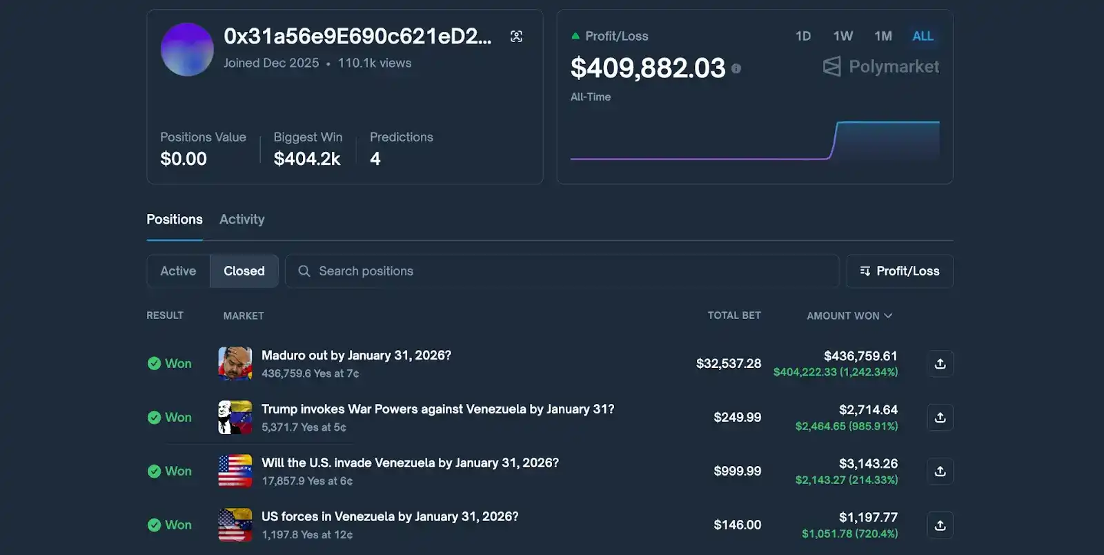 A new account created on Polymarket in late December 2025 seemed to have a god's-eye view, accurately predicting the event. The account made four predictions, all related to whether the U.S. would intervene in Venezuela, with the largest being a bet of $32,537 that "Maduro will step down by January 31." At the time, the market's expected probability for such an extreme event was in the single digits, and the account swept up contracts at the extremely low price of 7 cents.