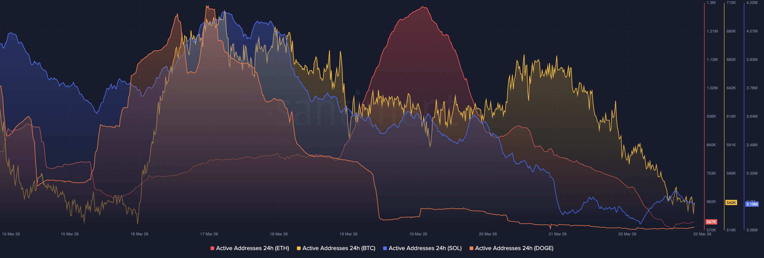 Additionally, across major networks like Ethereum [ETH], Solana [SOL], and Dogecoin [DOGE], activity levels have been either flat or falling. Ethereum did see a sudden jump in active users around 19 March, but it didn’t last long. This suggested that maybe, it was driven by short-term events.