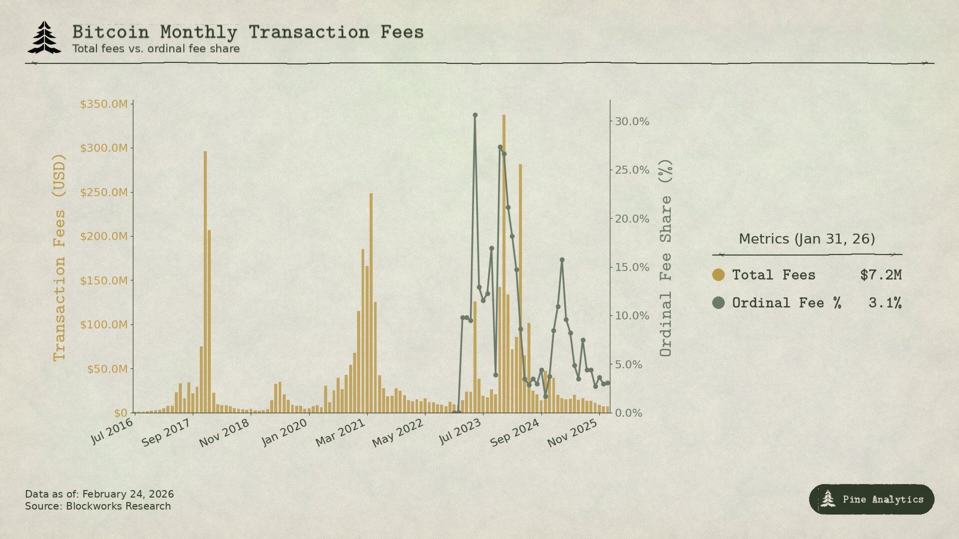 By the 2021 BTC price peak, although the price reached $64,000, the monthly fee revenue was actually lower than in 2017. There were fewer on-chain transactions then, but the dollar-denominated transfer volume was 2.6 times higher than in 2017—simply put, the network transferred more value, but the fees captured did not keep pace, and even decreased.