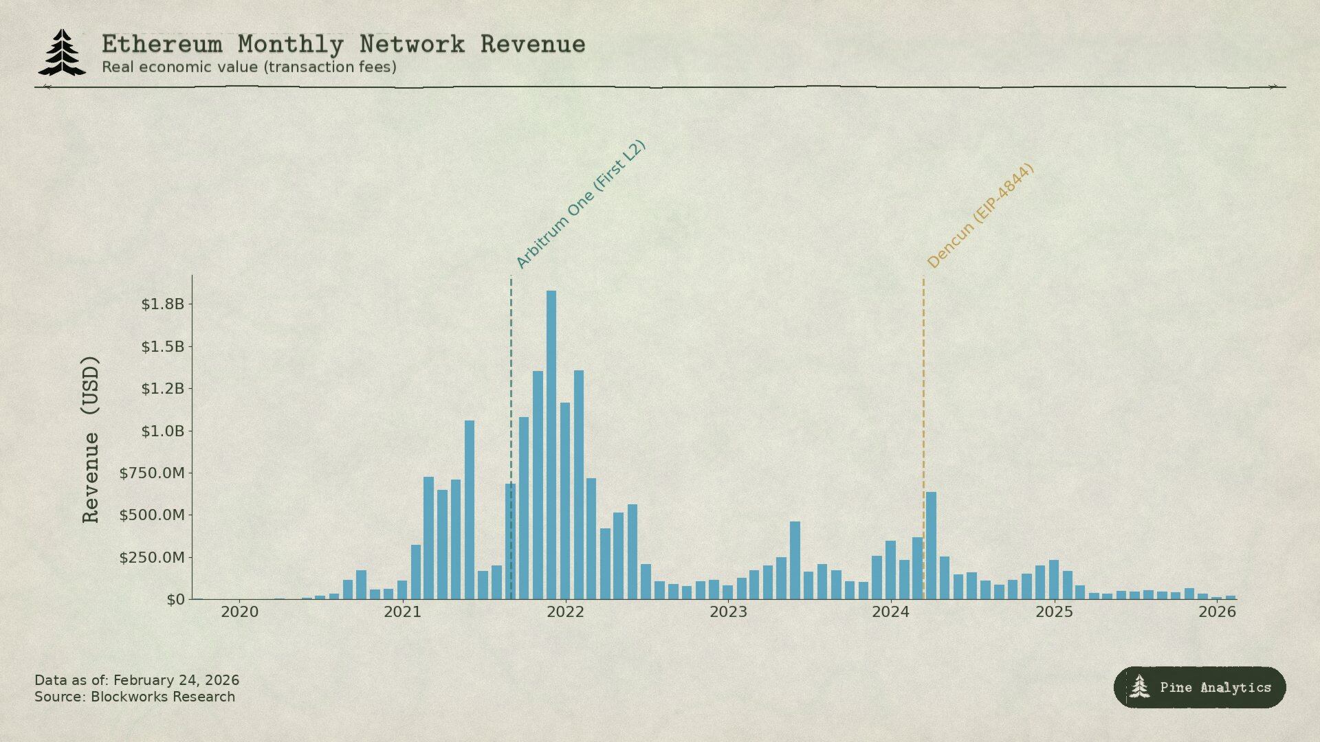 The data makes this even clearer. In 2024, L2s generated $277 million in revenue but paid only $113 million to Ethereum. By 2025, L2 revenue fell to $129 million, while the amount flowing back to Ethereum was only about $10 million, less than 10% of L2 revenue, a year-on-year decrease of over 90%. The once monthly average L1 fee revenue of over $100 million had fallen below $15 million by Q4 2025. The chain that created $4.3 billion in revenue in a single quarter saw its revenue scale shrink by about 95% just four years later.