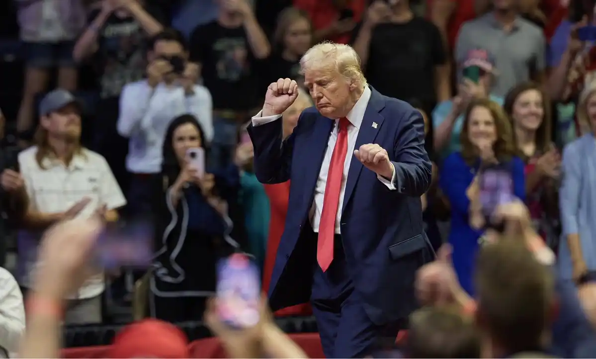 Caption: Trump doing his signature dance at a 2024 Michigan rally