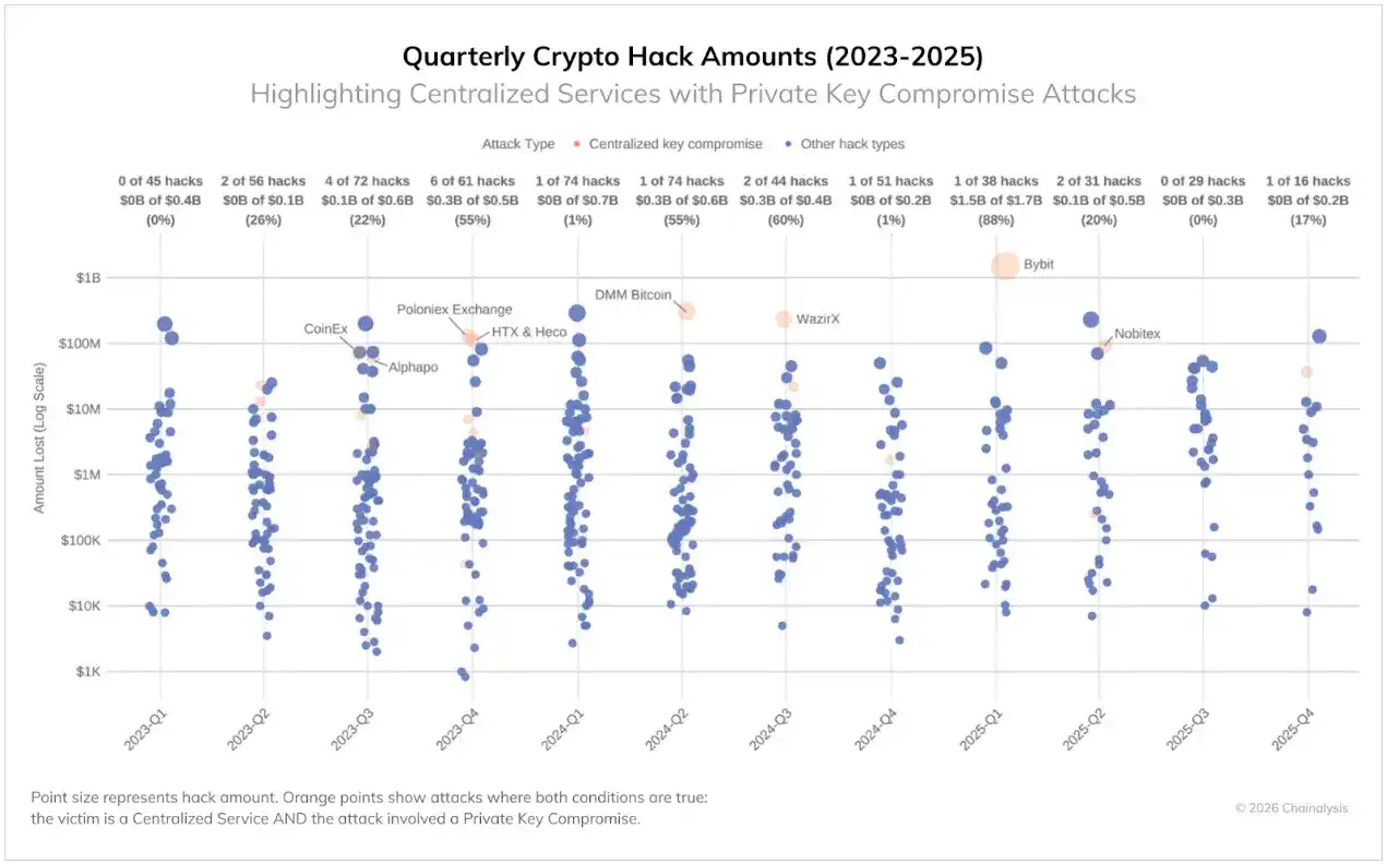 This widening gap leads to highly concentrated losses. The top three hacks in 2025 accounted for 69% of all losses, with individual events having an exceptionally significant impact on the annual total. Although attack frequency may fluctuate, and the median loss increases with rising asset prices, the potential loss from individual major vulnerabilities is rising at an even faster rate.