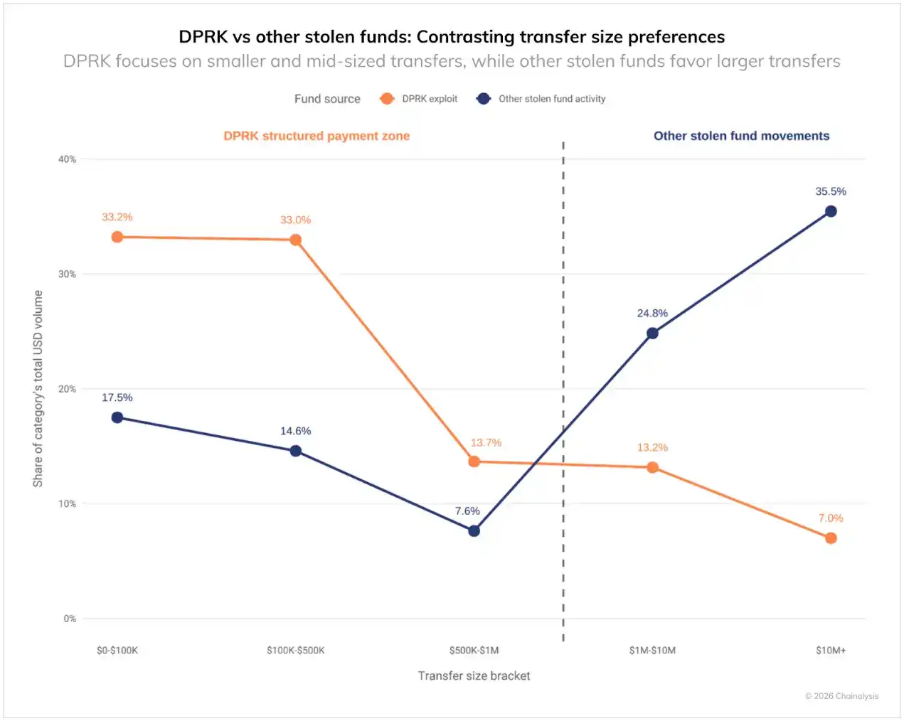 North Korea's money laundering activities show a distinct "bucketing" pattern, with over 60% of transaction volumes concentrated below $500,000. In contrast, other hackers batch over 60% of their on-chain movements in the $1 million to over $10 million range. Although North Korea launders larger amounts per incident than other hackers, they break on-chain transfers into smaller batches, highlighting the sophistication of their laundering methods.