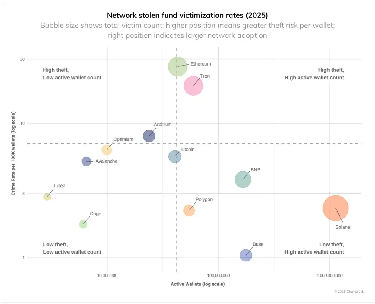 Victim data for specific networks provides more insight into which areas pose the greatest threat to crypto users. The chart below shows victim data adjusted for active individual wallets per network. Measured by the 2025 crime rate per 100,000 wallets, Ethereum and Tron have the highest theft rates. Ethereum's large user base indicates both a high theft rate and a high number of victims, while Tron's ranking shows a high theft rate despite a smaller number of active wallets. In contrast, Base and Solana show lower victimization rates despite their large user bases.