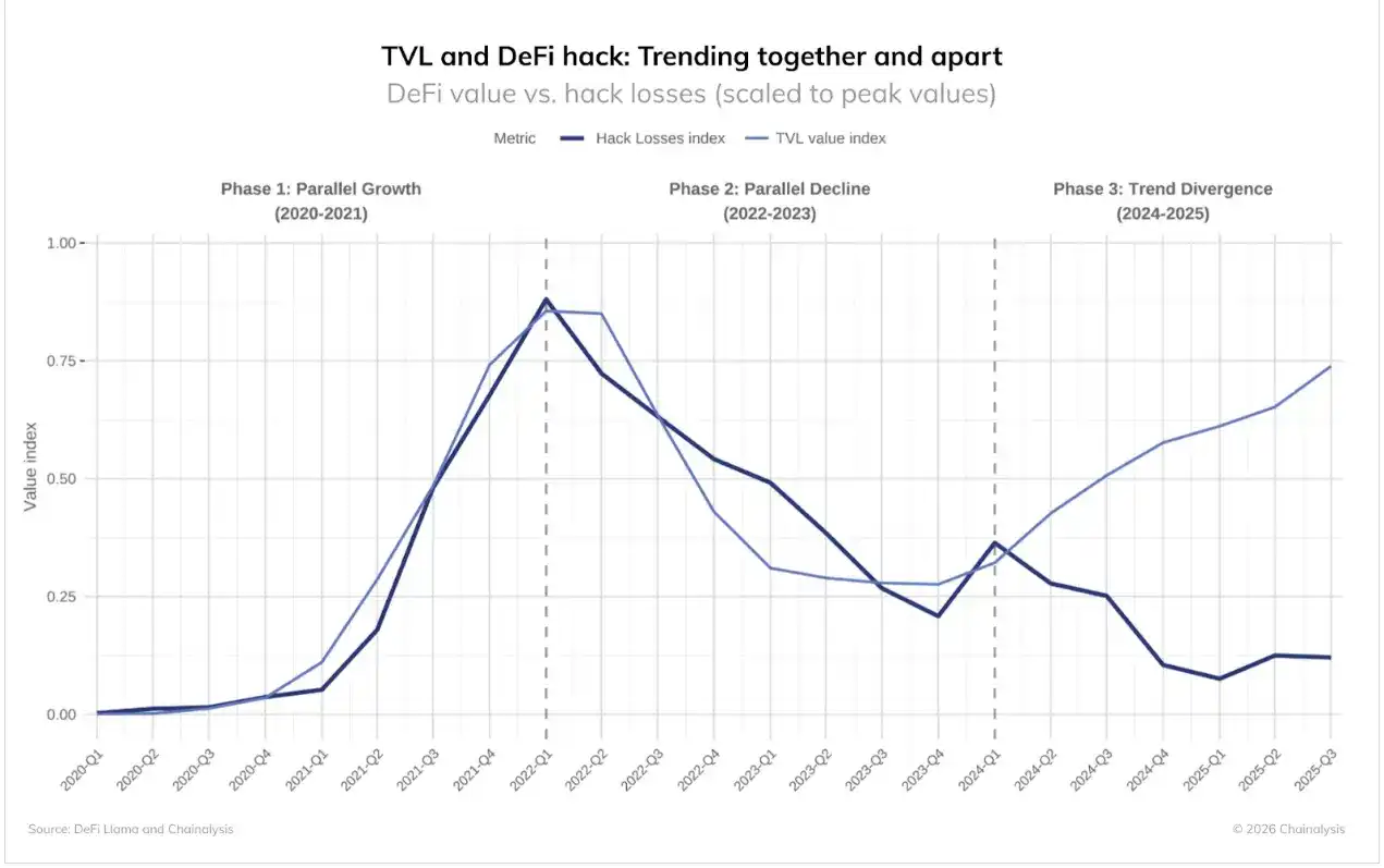 · Despite an increase in Total Value Locked (TVL) in DeFi, hacking losses from 2024 to 2025 remained relatively low, indicating that improvements in security measures are having a significant effect.