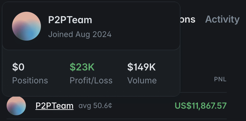 AThe 'P2P Team' account recorded approximately $149,000 in trading volume and around $23,000 in profit and loss, with individual positions generating gains of over $11,000.