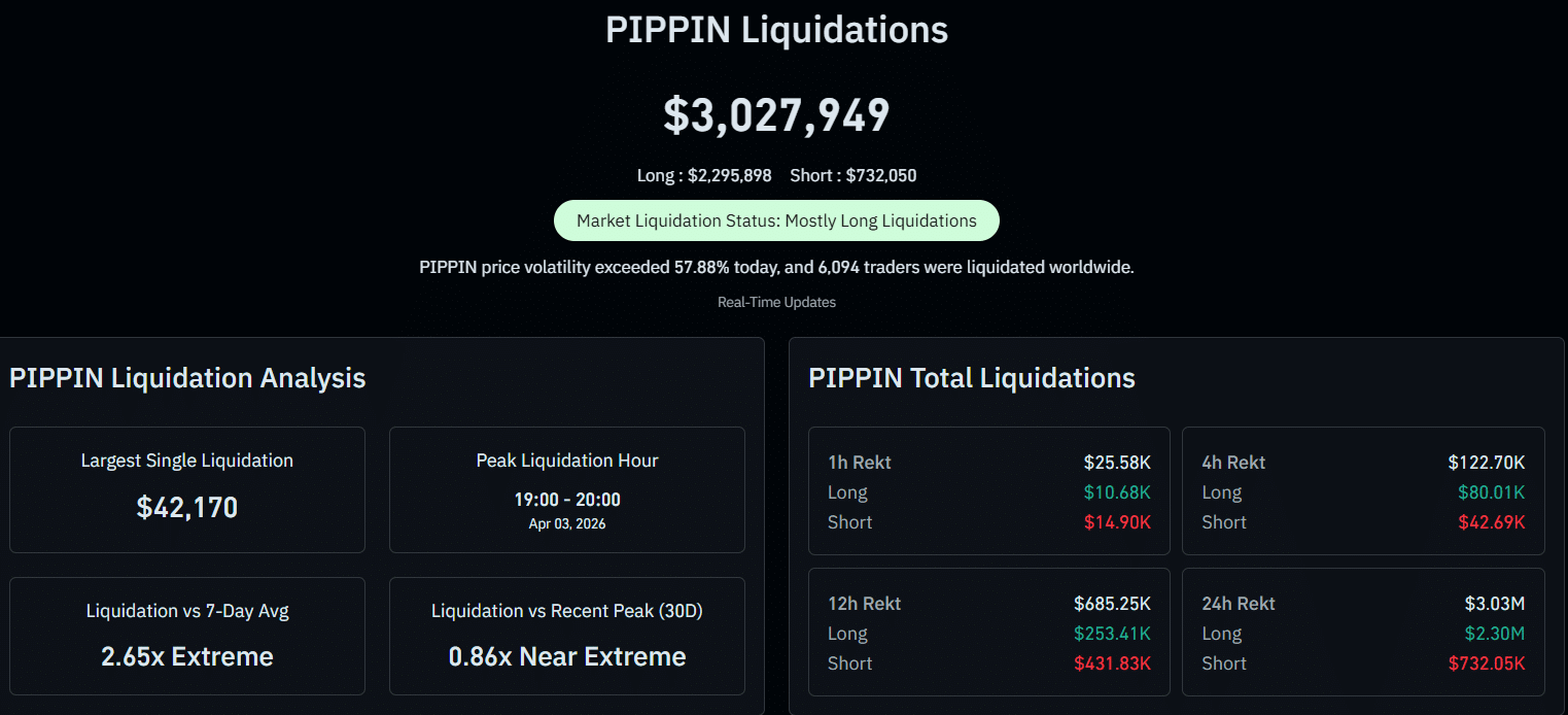 Liquidations took control of the move and accelerated PIPPIN’s breakdown, turning a weak structure into a rapid unwind. As prices dropped, about $3.03 million in positions were liquidated, with $2.30 million in longs, showing buyers were overexposed.