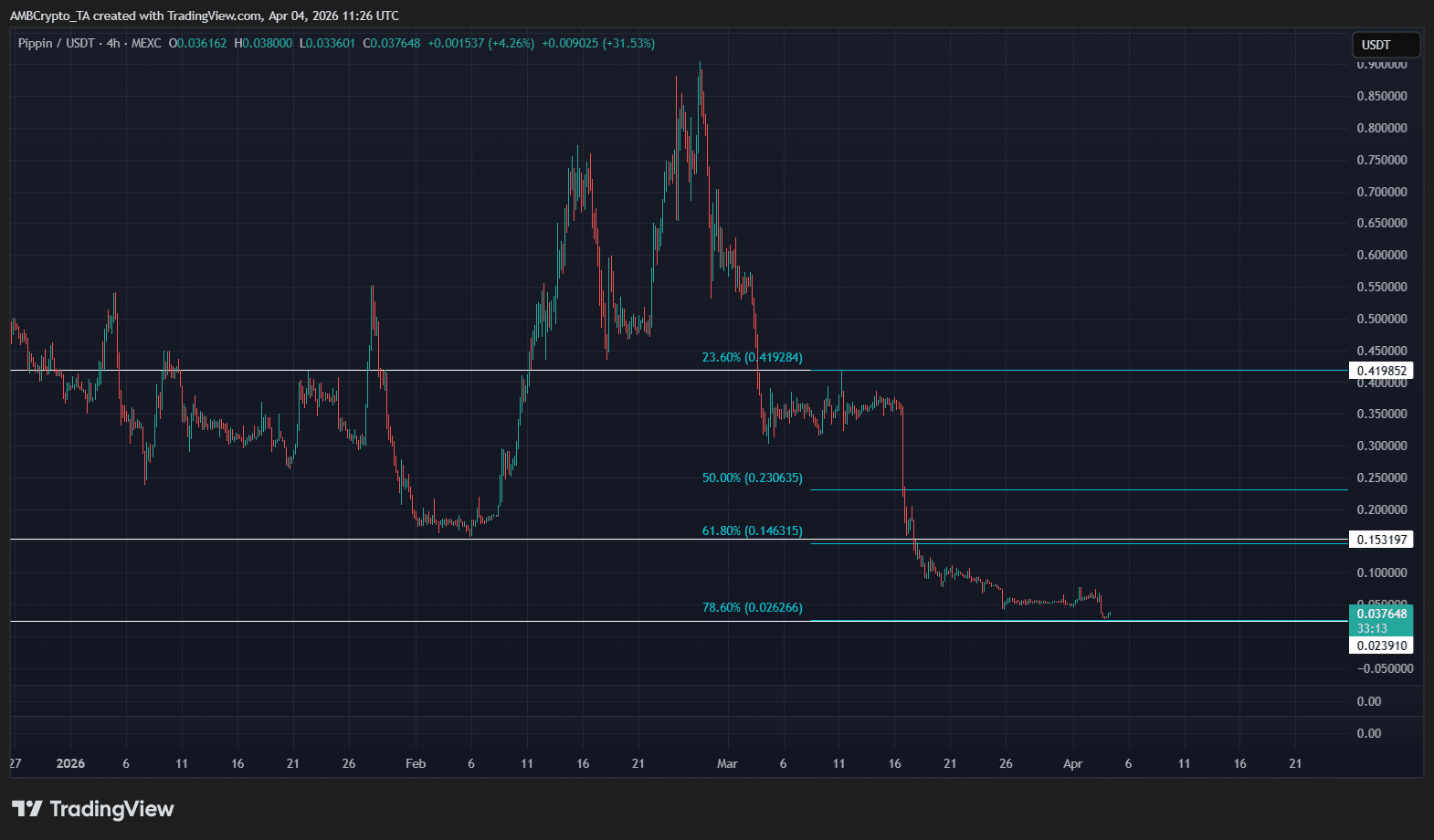 Pippin’s [PIPPIN] market shifted from expansion into exhaustion, as a sharp drop from near $0.80 toward $0.035 signaled a clear liquidity flush. This move exceeded 44% on rising volume, which shows forced exits as speculative momentum unwinds.