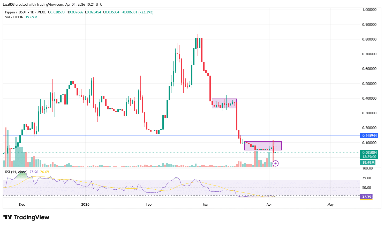 PIPPIN experienced a severe market crash, plummeting over 44% from nearly $0.80 to around $0.035, driven by a liquidation cascade that forced approximately $3.03 million in positions to close—$2.30 million of which were long positions. This sharp decline reflected a shift from expansion to exhaustion, wiping out speculative momentum and triggering a market reset. The price structure weakened, showing lower highs and fading demand throughout March. Currently, PIPPIN is stabilizing near the $0.03–$0.037 support zone, with RSI indicating oversold conditions at 27.9, suggesting reduced selling pressure. The market remains fragile; holding this support could lead to a relief bounce toward $0.15, but failure may result in further downside, extending the reset phase.