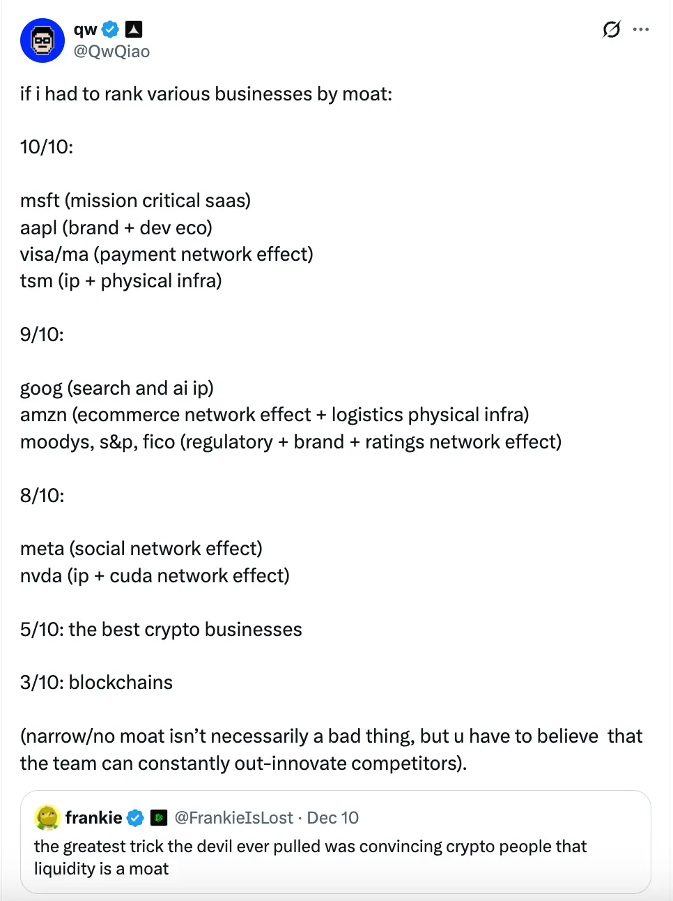 In response to qw's "moat rating system," Dragonfly partner Haseeb posted angrily: "What? 'Blockchain moat: 3/10'? That's a bit absurd. Even Santi doesn't think public chains have 'no moat.'