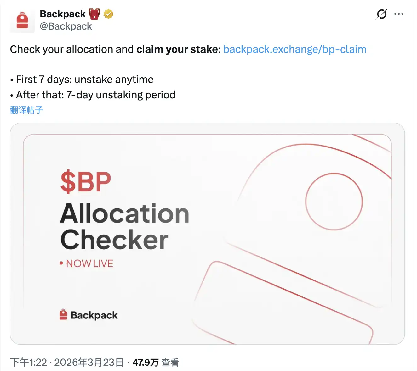Yesterday, Backpack finally opened the BP token claim channel. According to the previously announced rules, 25% of the total token supply (approximately 250 million BP) in this TGE would be allocated entirely to the community, with 24% going to points holders and 1% to Mad Lads NFT holders. The official emphasized that aside from this portion, which fully belonged to the community, no team or investor shares were involved in the initial circulation.