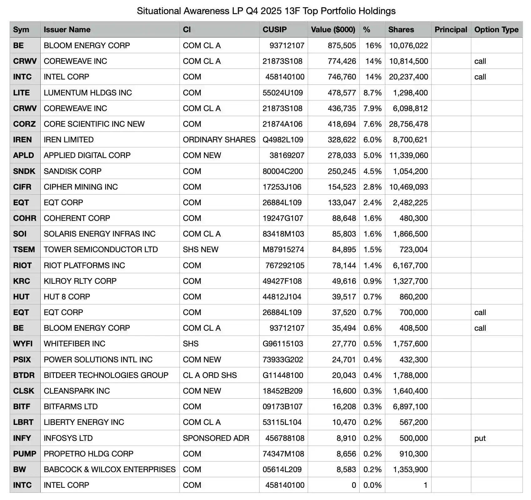 This is one of the hottest names in the AI investment circle right now — the 24-year-old's Situational Awareness LP fund had a disclosed public holdings value of "only" $225 million in Q4 2024, but in the holdings disclosure for Q4 2025 released last month, this number has rapidly grown to $5.5 billion.