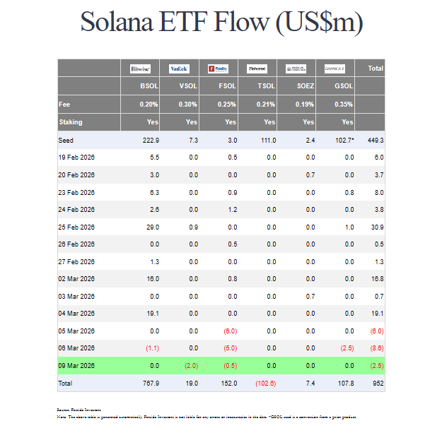 ANet flows into Solana ETFs have stayed relatively steady in recent months, even as the token price fell.