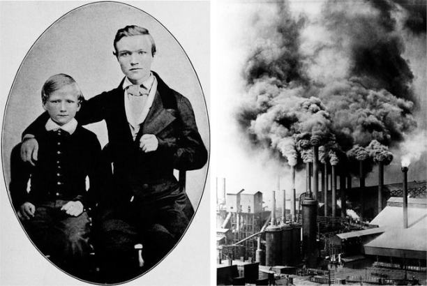 Left: Young Andrew Carnegie and his brother. Right: A steel mill in Pittsburgh during the Gilded Age.