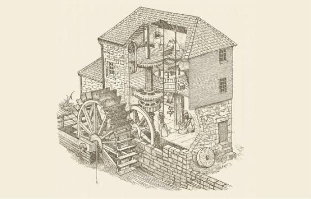 A mill powered by a waterwheel. Water power was powerful but unreliable and limited by location and season.