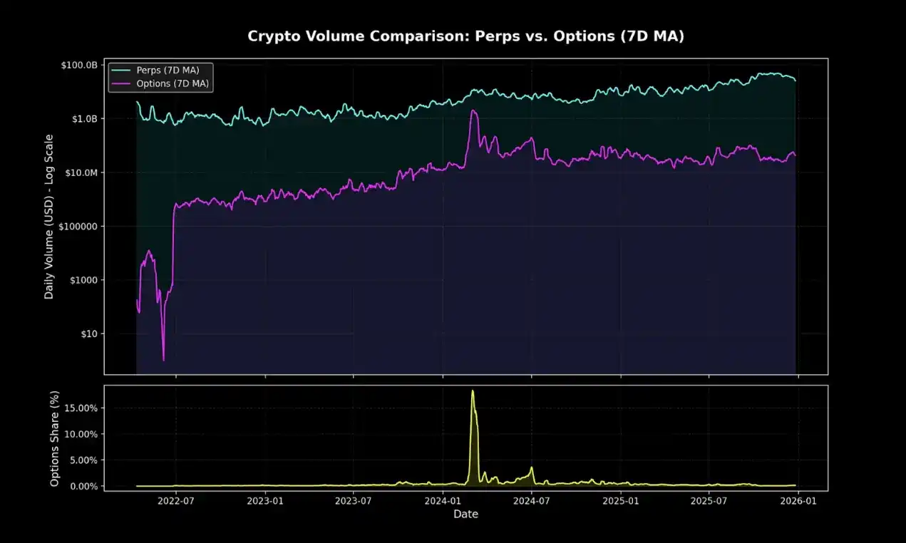 Ironically, options, which are theoretically safer and more aligned with user intent, are less popular than the riskier, more complex perpetual contracts.