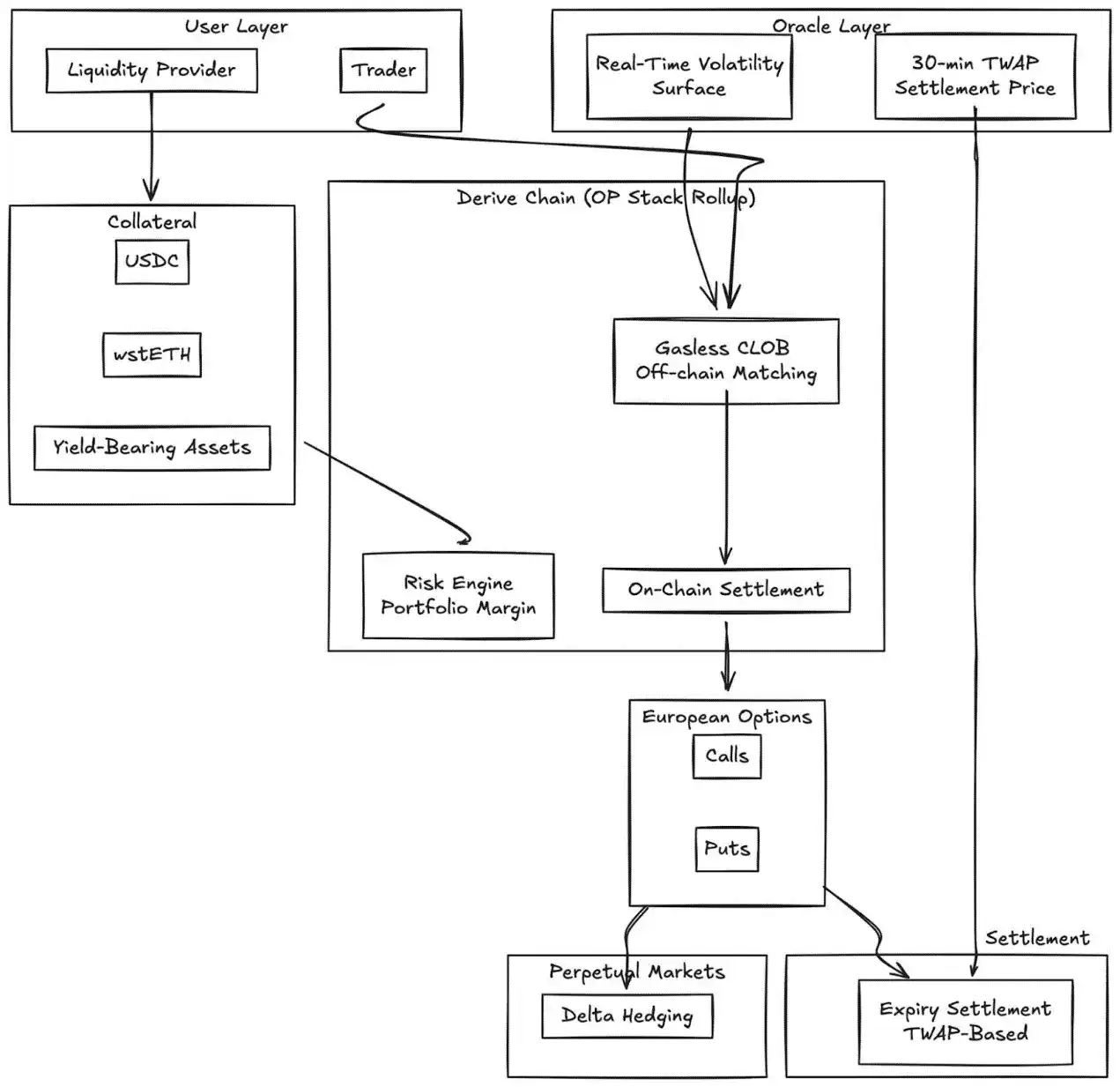 Derive (formerly Lyra) transitioned from its pioneering AMM architecture to a gasless central limit order book with on-chain settlement. The protocol offers fully collateralized European options with dynamic volatility surfaces and settlement based on 30-minute TWAP.