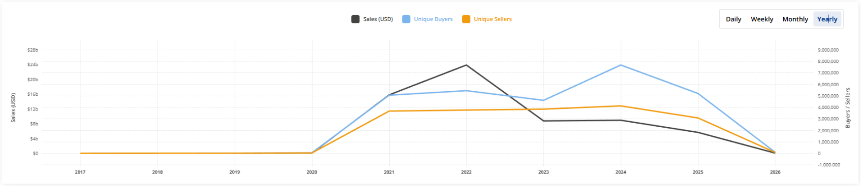 Supply Explosion. According to CryptoSlam data, the supply in 2025 increased by 35% compared to 1 billion in 2024. Over the past four years, the total number of NFTs has skyrocketed from 38 million to 1.34 billion, a growth of approximately 3,400%.