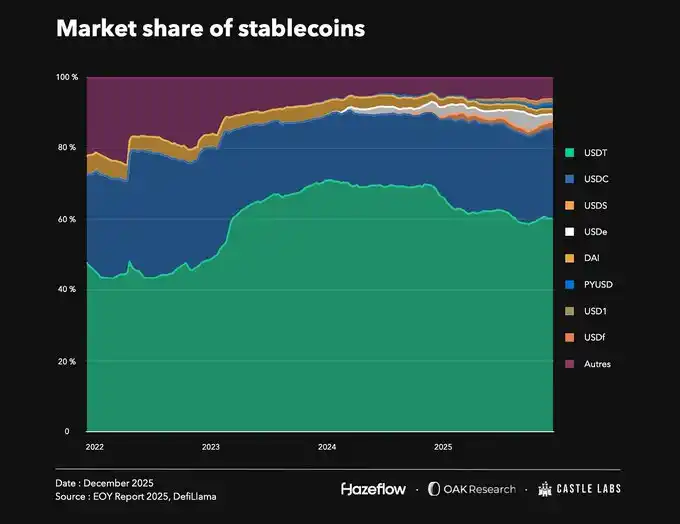 Despite the numerous issuers, the market is still dominated by @Tether_to (USDT) and @circle (USDC), which together hold an 85% market share, followed by protocols like Ethena (USDe) and @SkyEcosystem (USDS). With first-mover advantages and deep on-chain integrations, Tether and Circle maintain their dominance despite the constant influx of new players.