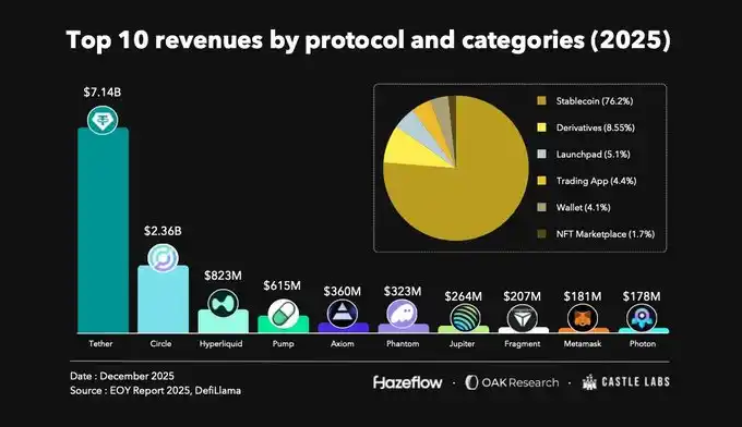 Over the past year, Tether and Circle combined generated $9.8 billion in revenue and continue to maintain a similar scale. Following them are Hyperliquid and Jupiter in the derivatives sector, with combined revenue of approximately $1.1 billion.
