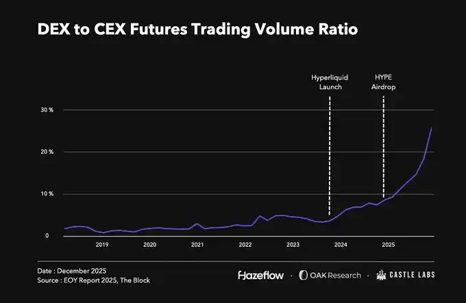 Perpetual trading has long been a major component of the crypto market, with daily trading volumes in the tens of billions of dollars. But before this year, the vast majority of this volume occurred on centralized exchanges. This landscape began to change with Hyperliquid's large airdrop at the end of 2024, reigniting interest in on-chain perpetual contracts and intensifying competition. To date, the proportion of DEX perpetual trading volume relative to CEX has reached a record high of about 18%. Currently, protocols like @Lighter_xyz, @Aster_DEX, @extendedapp, @pacifica_fi, and many others are entering this sector, competing for a share of the growing on-chain perpetual trading pie.