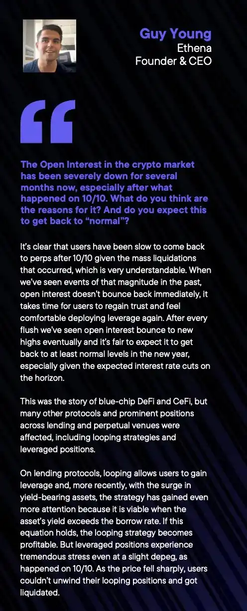 @ethena_labs was another highlight this year. Ethena offers a synthetic dollar stablecoin, USDe, which is a yield-bearing asset that generates returns through basis trading. USDe is backed by volatile assets like BTC, ETH, and LSTs. To maintain delta neutrality, Ethena hedges its spot holdings and simultaneously opens perpetual short positions as margin. Although the position is delta-neutral, it earns yield from the funding rates paid by longs to shorts in perpetual contracts.