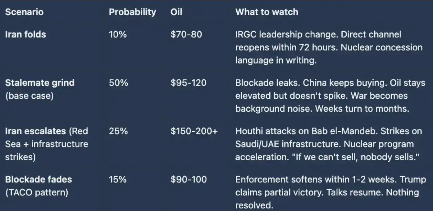 Scenario 4: Blockade Fails (TACO Mode). Probability 15%, Oil Price $90–100, Observational Signals: Enforcement weakens within 1–2 weeks, Trump declares "phased victory," negotiations restart but core issues remain unresolved.
