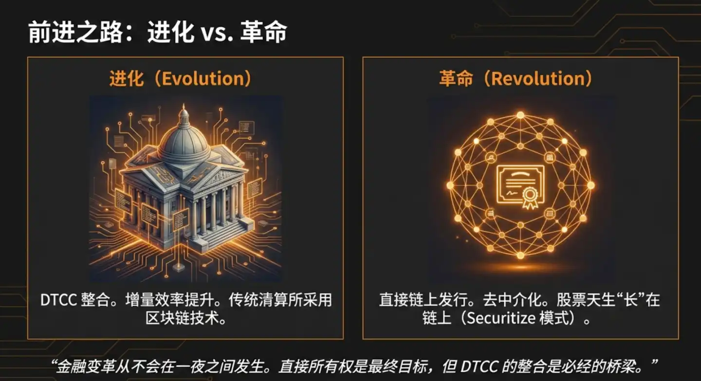 - The industry is bifurcating into two paths: Incremental (DTCC integration, increasing efficiency) and Revolutionary (direct on-chain issuance, full disintermediation).