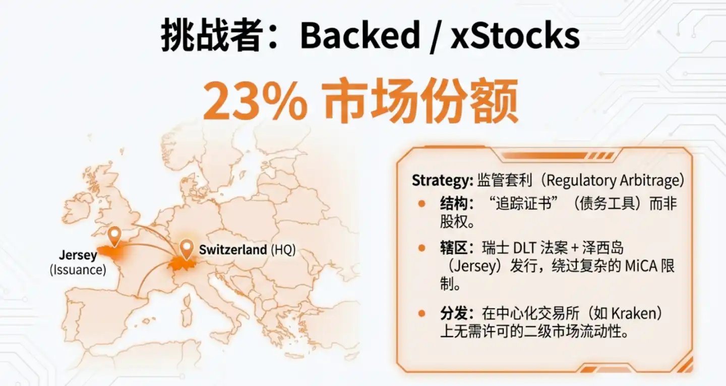 - Backed / xStocks (23% share): Broke through using 'Legal Alpha'. By structuring products as tracker certificates (debt) under the Swiss DLT Act, they cleverly circumvented MiCA's restrictions on the transfer of direct equity tokens, enabling free flow and composition within the DeFi ecosystem.