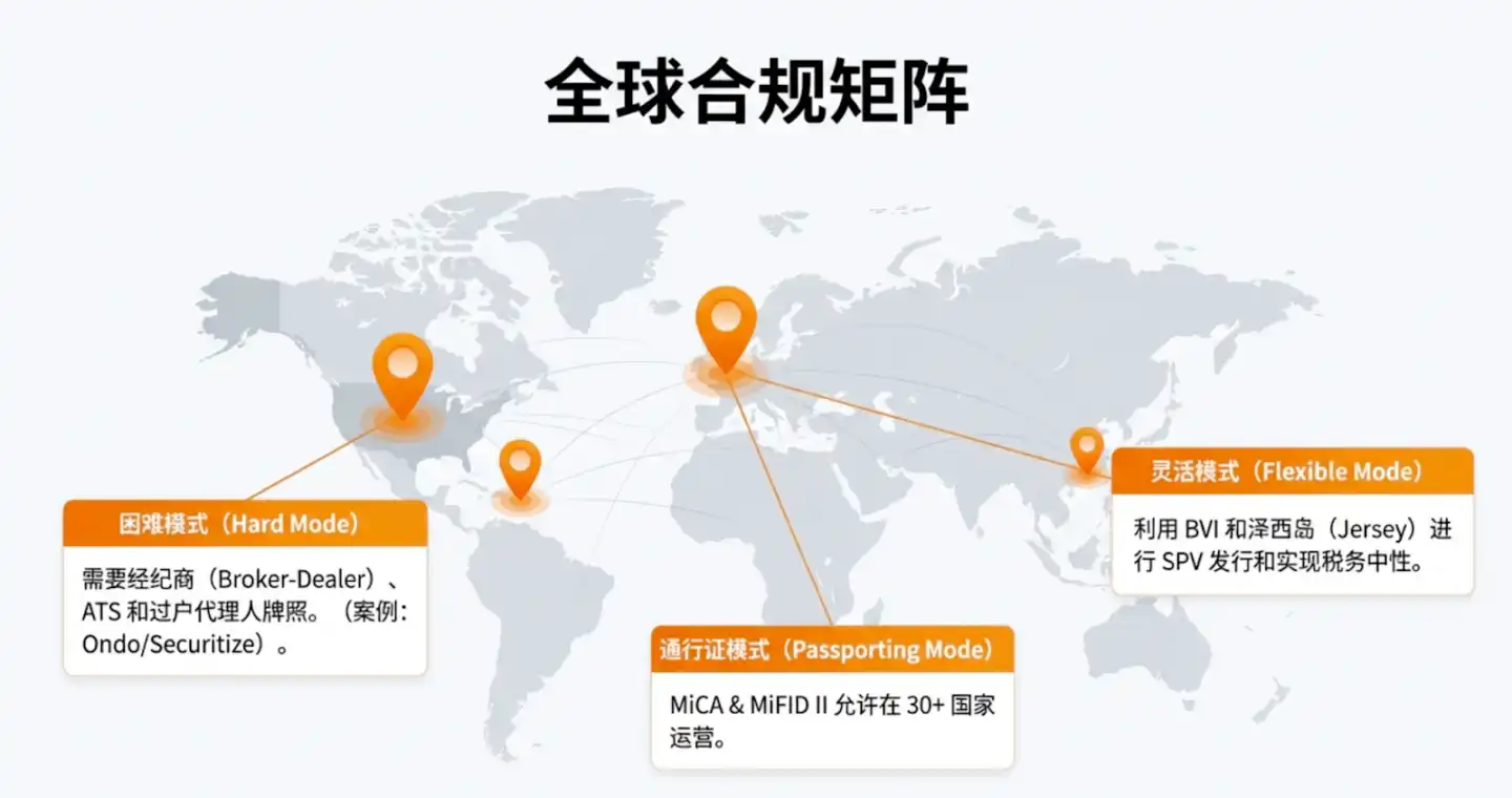 - US Model (Hard Mode): The cornerstone of success is the 'trident' combination of Broker-Dealer, ATS, and Transfer Agent licenses. Ondo acquired this full suite of capabilities through its acquisition of Oasis Pro, mastering the complete closed loop from onboarding to secondary market matching.
