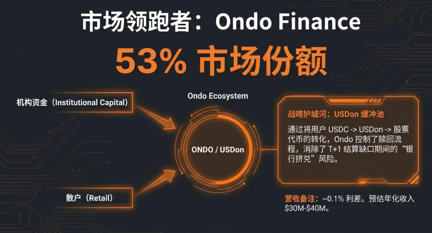 - Ondo Finance (53% share): The absolute dominator. Its revenue engine relies on a ~0.1% trading fee spread, with estimated annualized revenue of $30M-$40M. Its core moat is a highly sophisticated USDon buffer pool and an extensive network of licensed institutional partners.