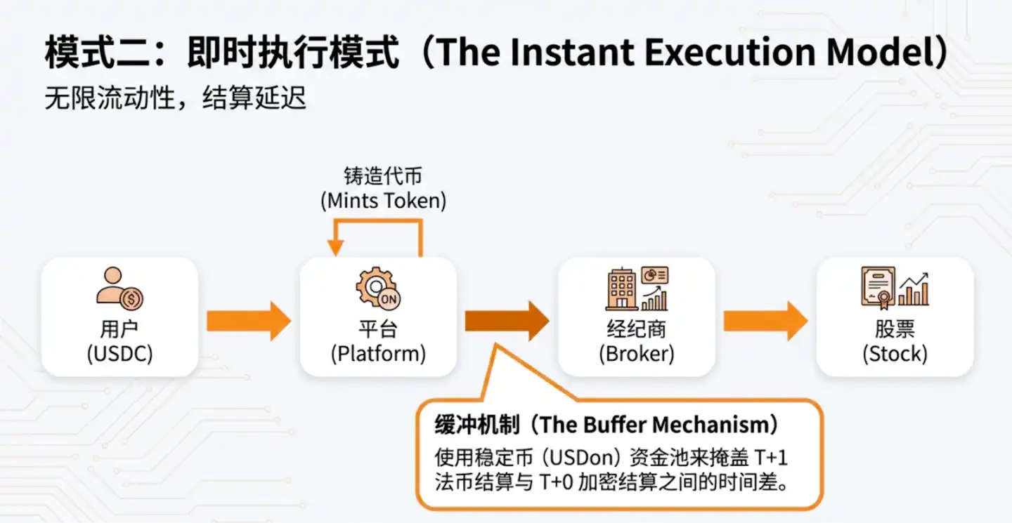 - Instant Execution Model (e.g., Ondo, CyberAlpha): An 'on-demand liquidity' solution. Stock purchase and token minting are only triggered when a user confirms an order.