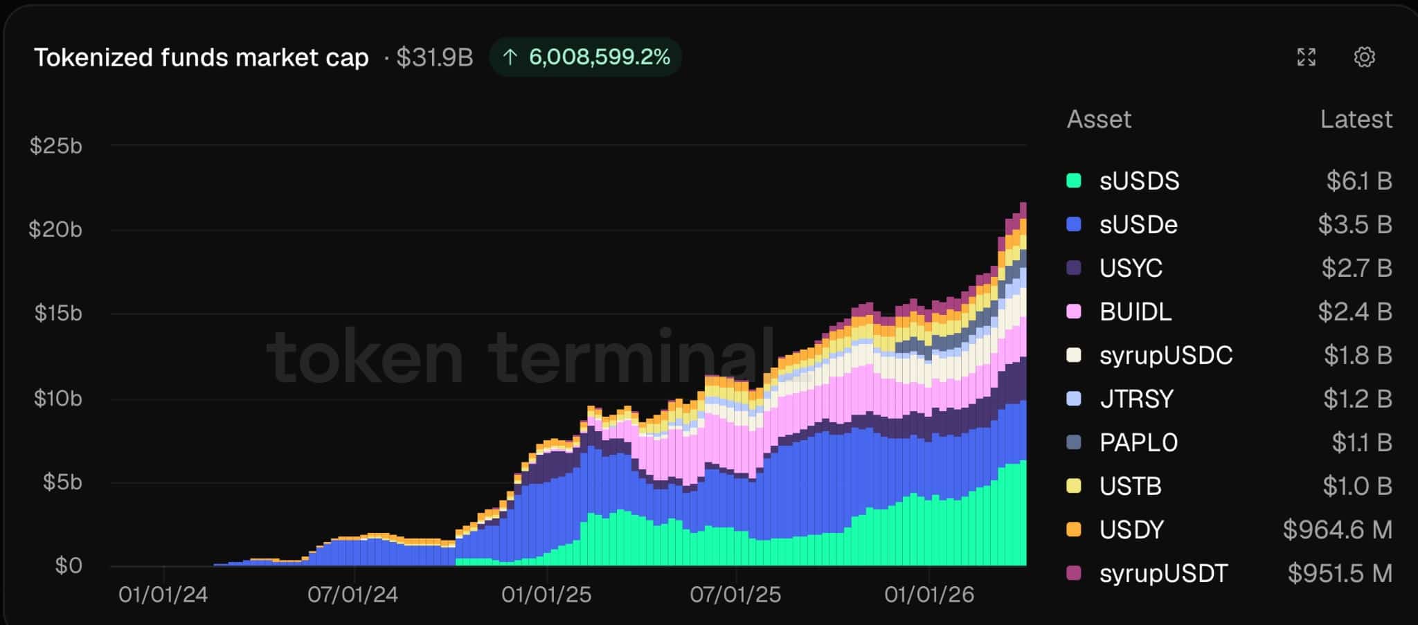 AThe tokenized funds market was valued at $31.9 billion, with growth being led by yield-oriented, income-bearing on-chain products rather than plain cash proxies.