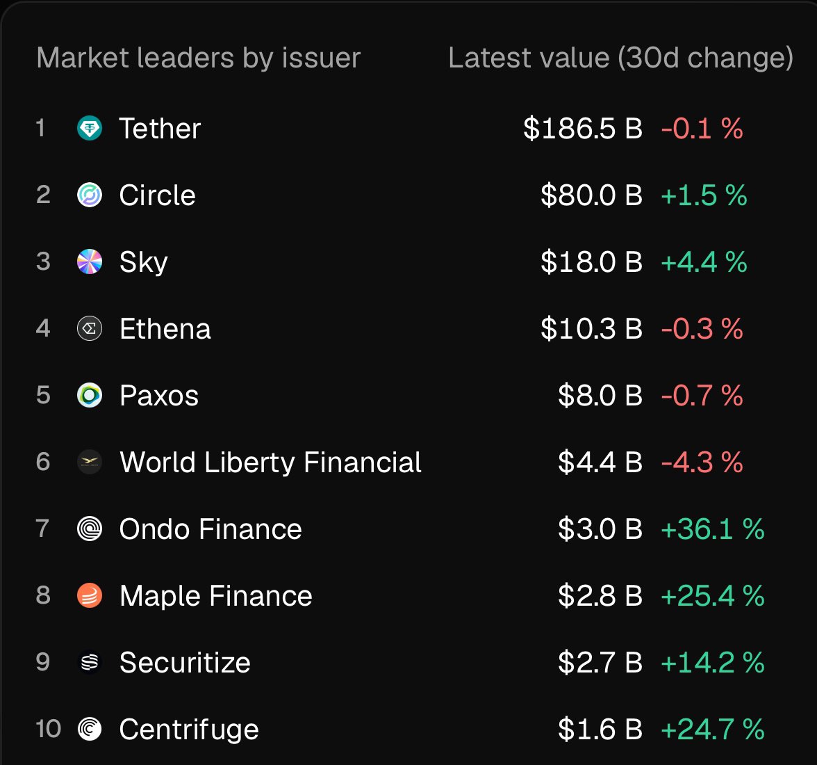 At press time, Tether still led issuance by a wide margin at $186.5 billion, while Circle followed at $80.0 billion. However, the faster growth is happening lower down the table.
