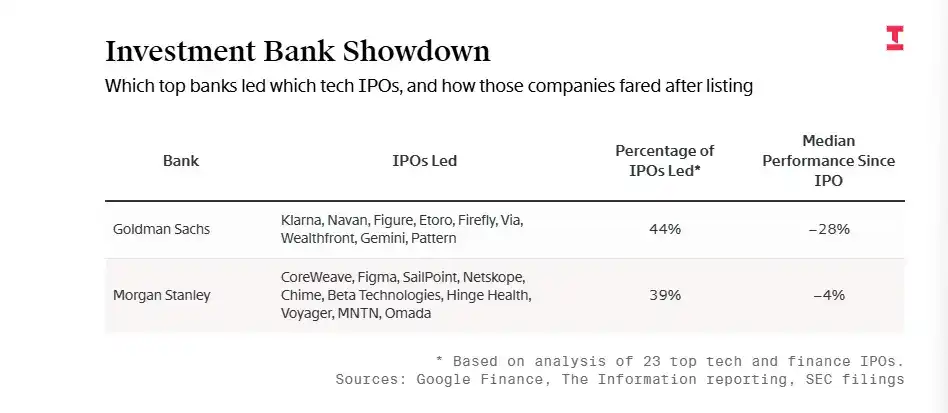 The poor performance of 2025 IPOs also puts the investment banks Goldman Sachs and Morgan Stanley, which led the majority of tech listings, in an awkward position.