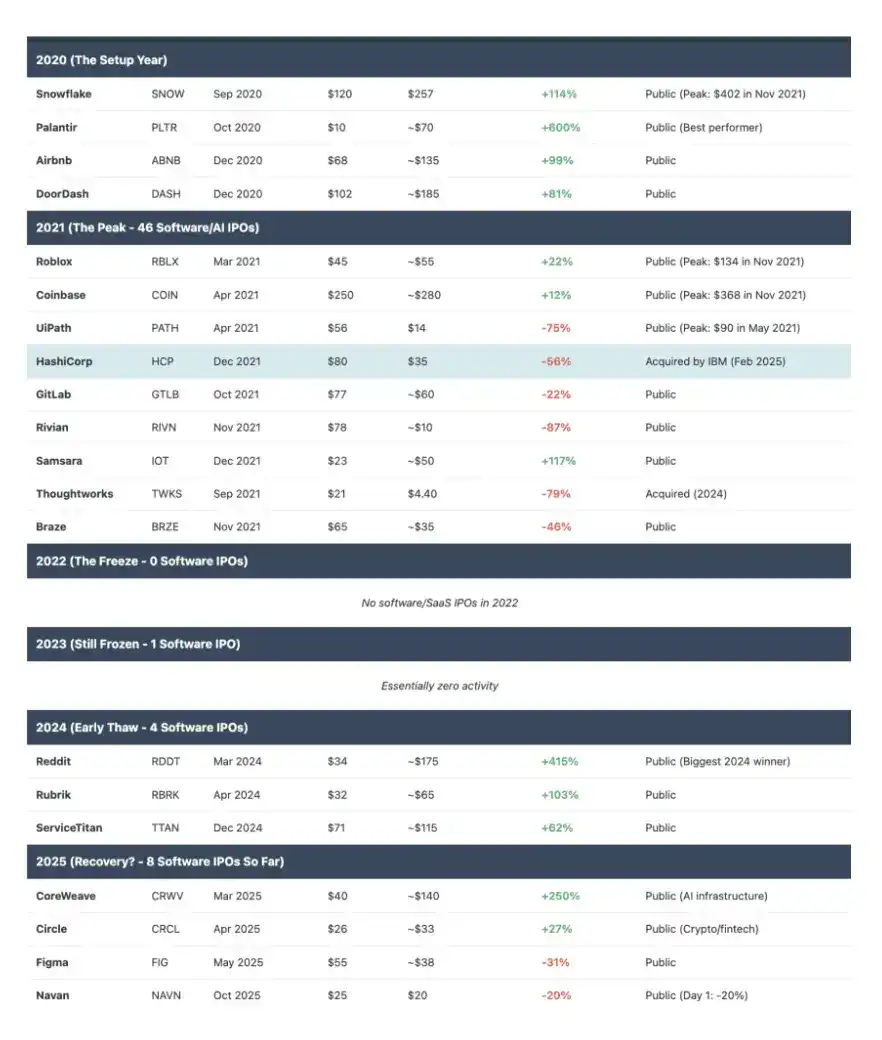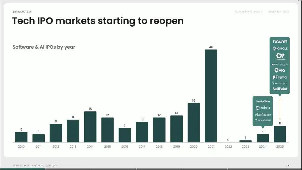 However, the number of software and AI IPOs in 2025 was only about half of the 2021 peak, lower than the "normal" benchmark of 9-10 per year from 2010-2018. This indicates that the tech IPO market still has a long way to go before truly returning to normal.