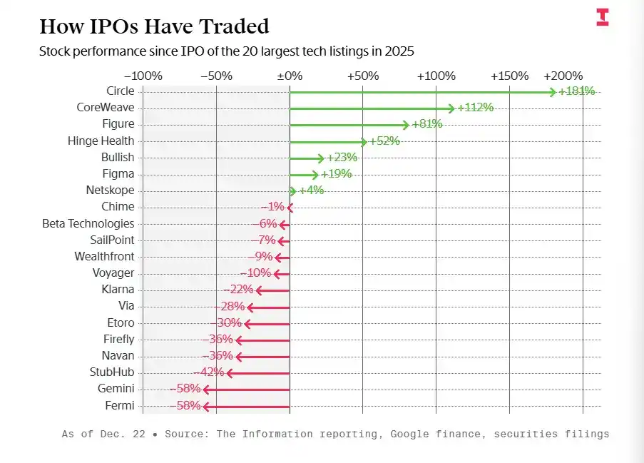 In 2025, although the number of tech company listings showed signs of recovery (about 23, significantly increased compared to 2024), the overall performance was dismal: over two-thirds of the companies saw their stock prices fall below the issue price, with a median decline of 9%, significantly underperforming the S&P 500 index, which rose nearly 18% during the same period.