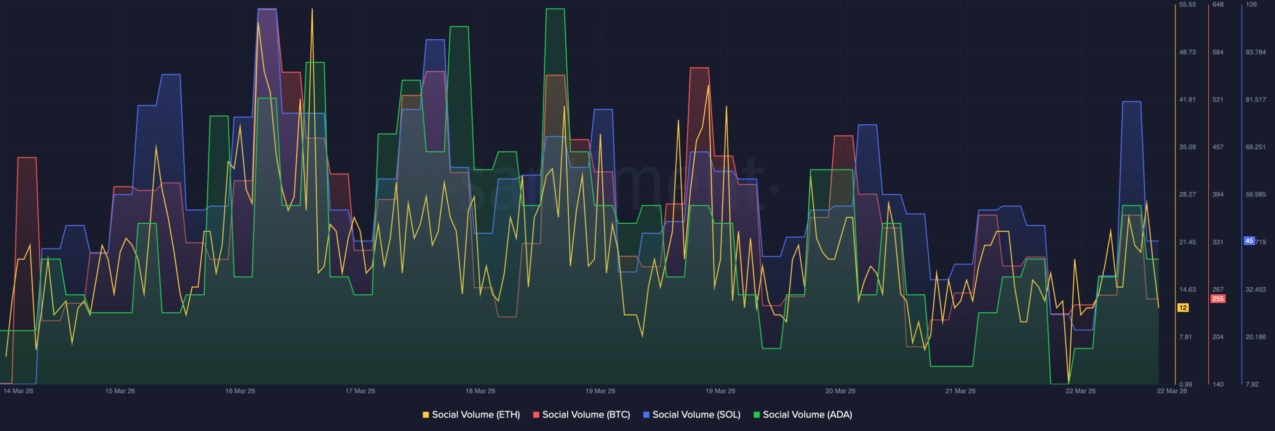 Bitcoin, on the other hand, is seeing more steady attention, which shows that people still see it as a safer option during uncertain times. Meanwhile, Cardano [ADA] is getting attention only during specific updates, not because of the bigger global situation.