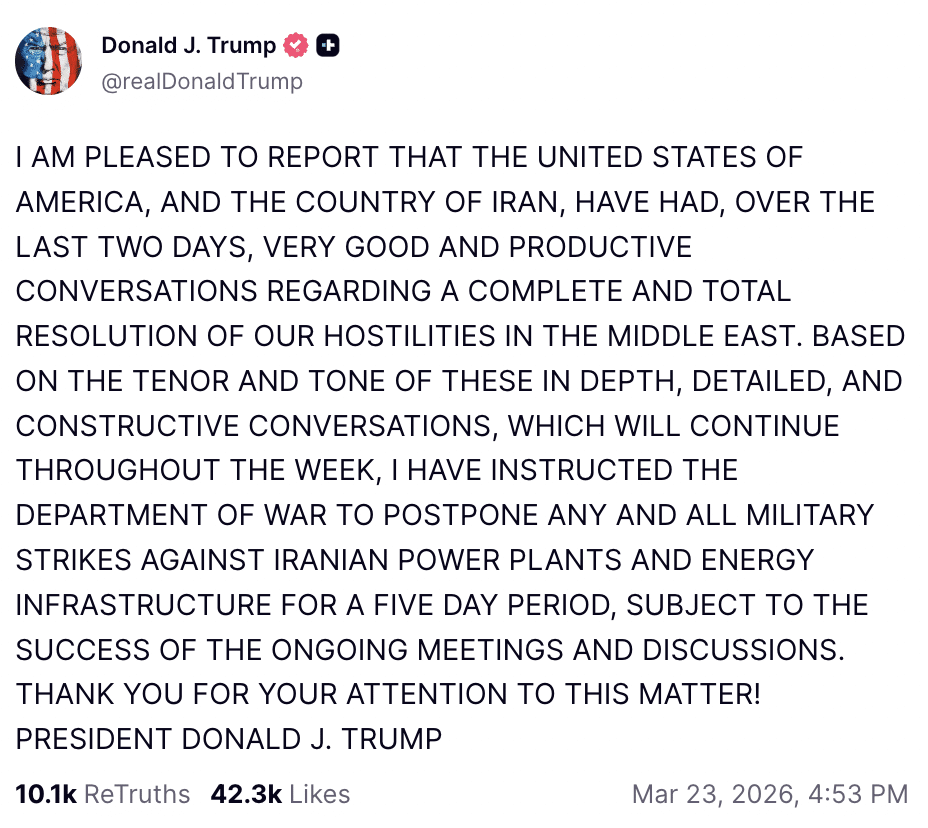 Global energy markets paused on the 23rd of March after U.S. President Donald Trump suddenly stepped back from his 48-hour threat to destroy Iran’s power grid.