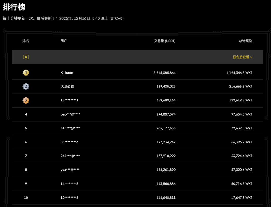 Since its launch on November 26, the event has attracted active participation from global users, with trading heat continuously rising. According to WEEX official data, as of 18:00 on December 16 (UTC+8), the top 100 users on the 'Futures Mining' leaderboard have accumulated a total futures trading volume of $9.172 billion, with total mining rewards of 3,015,047.7 WXT (data updating in real-time).