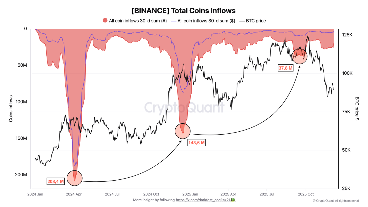 According to the report, inflows of cryptocurrencies onto Binance remain unusually low, even as Bitcoin has experienced one of its deepest pullbacks of the cycle. Historically, during significant corrections, investors tend to send large amounts of BTC and other assets to exchanges, signaling growing willingness to sell and escalating market fear. This pattern appeared repeatedly in past downturns, often marking periods of capitulation.