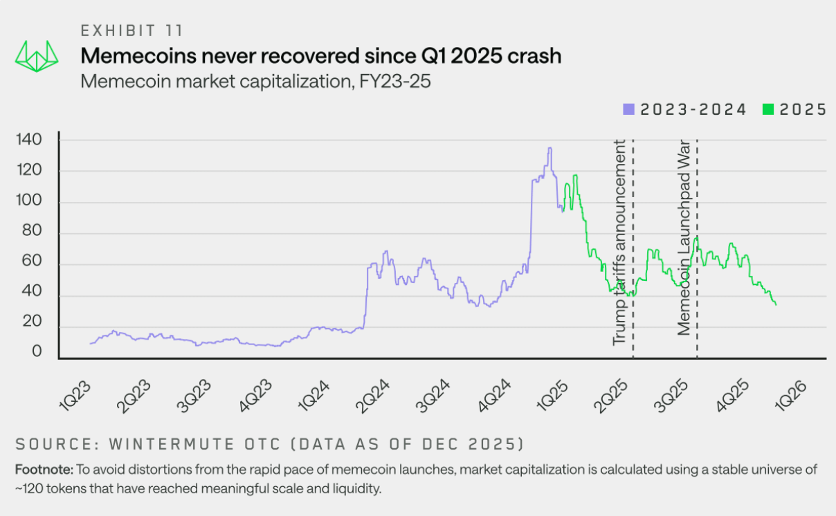 "Meme coins peaked in Q1 2025 and failed to recover, unable to regain support as trading became fragmented and narrowed."