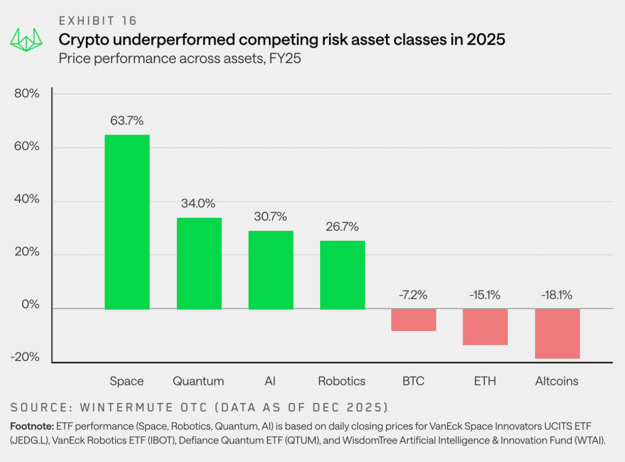 Consequently, retail investors favored equity themes like AI, robotics, and quantum technology, while BTC, ETH, and most altcoins lagged among major risk assets. Cryptocurrency is no longer the default outlet for excess risk-taking.