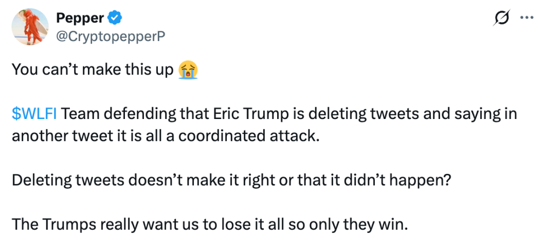 As prices fell, a large amount of FUD (Fear, Uncertainty, Doubt) emerged on X, such as claims that Eric Trump had deleted all Crypto-related tweets, or that there might be internal issues within the Trump family.